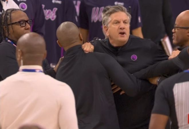 芬奇沖進(jìn)場內(nèi)追著裁判狂噴,在被多人合力攔住之后,芬奇還殺了一個(gè)回馬槍再度想要去怒噴裁判,被助教普里吉奧尼給攔了一下。
