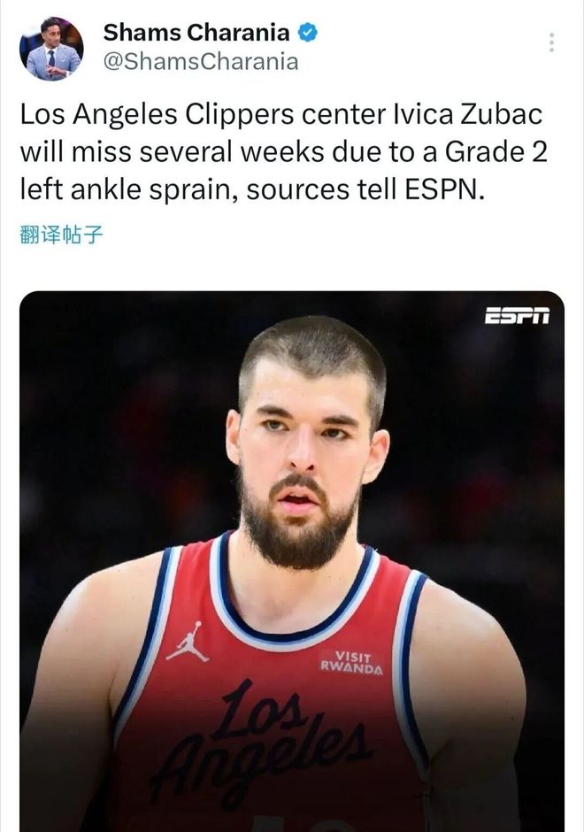 - 壞消息,快船隊中鋒伊維察·祖巴茨因腳踝受傷將至少缺席三周